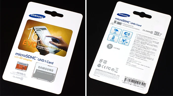 私が購入したマイクロSDカードは、サムスンのEVOシリーズ16GB(SD変換アダプター付き)。アマゾンで1,130円でした。アダプター無しのタイプなら1,080円。サムスンのマイクロSDカードには「EVO」と「PRO」、2種類のラインナップがあります。ハイパフォーマンスモデルの「EVO」シリーズ、プロフェッショナルモデルの「PRO」シリーズ。どちらもUHS-I対応、スピードクラス10の超高速モデルです(⇒SAMSUNG EVOとPROの違い。サムスンmicroSDカードの選び方)。